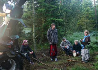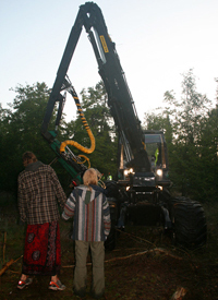 En lille kilometer væk kom nogle store skovnings-maskiner kørende. Der var nogle fra flokken som var løbet i forvejen og havde fået held til at standse maskinernes forehavende, da de drejede væk fra stien og ind i det område, der var planlagt at skulle ryddes. Da jeg kom, stod der to mennesker foran den forreste maskine. De holdt hinanden i hånden, og kiggede roligt op på føreren af skovningsmaskinen. Føreren havde standset motoren, og sad og talte i mobil. Der ville snart komme politi. Han virkede frustreret, og et øjeblik blev jeg rørt af medfølelse med ham. Han var bare taget på arbejde her til morgen, for at gøre hvad han havde fået besked på, som så mange gange før, og nu stod der så pludselig en flok miljø-aktivister foran hans maskine, og opfordrede ham til at tage stilling til tingene, og handle ud fra sin samvittighed. |