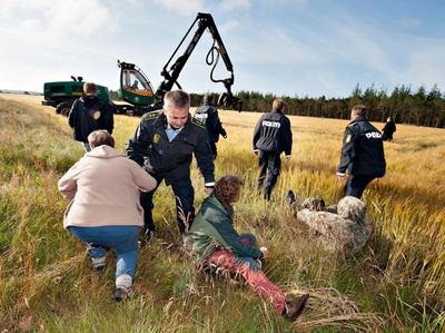 Den morgen vandt vi over maskinerne. En venlig politimand kom ud, og efter en kort snak med skovarbejderne, fik vi at vide, at vi havde vundet i denne omgang. Jeg syntes at kunne spore en vis lettelse i mandens øjne, som han gik der og hyggesnakkede med os på vej tilbage gennem skoven. Han kendte jo området, og kom der dagligt med sin hund. Bag sin funktion af betjent, havde han følelser og holdninger til sagen, der ikke nødvendigvis harmonerede med den opgave han nu var sendt ud i. |